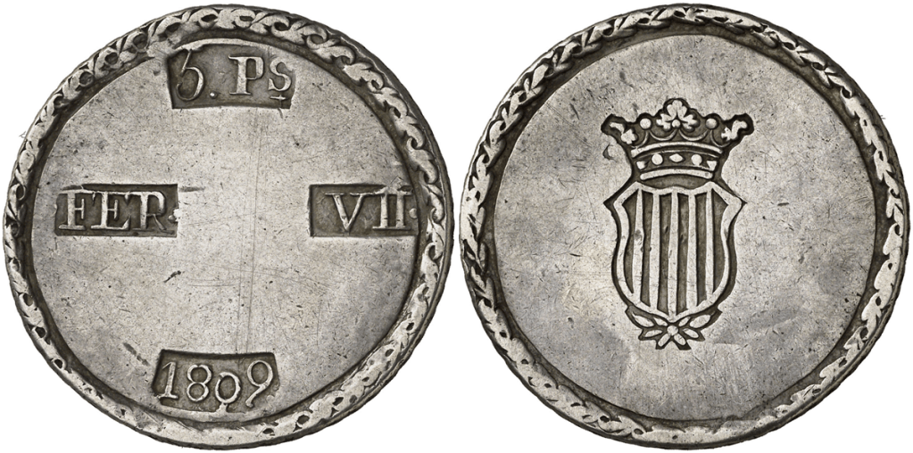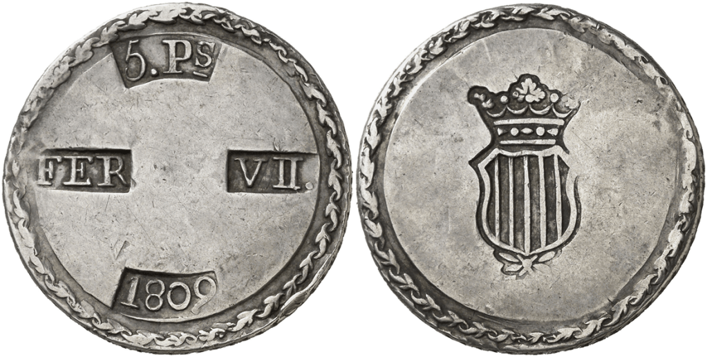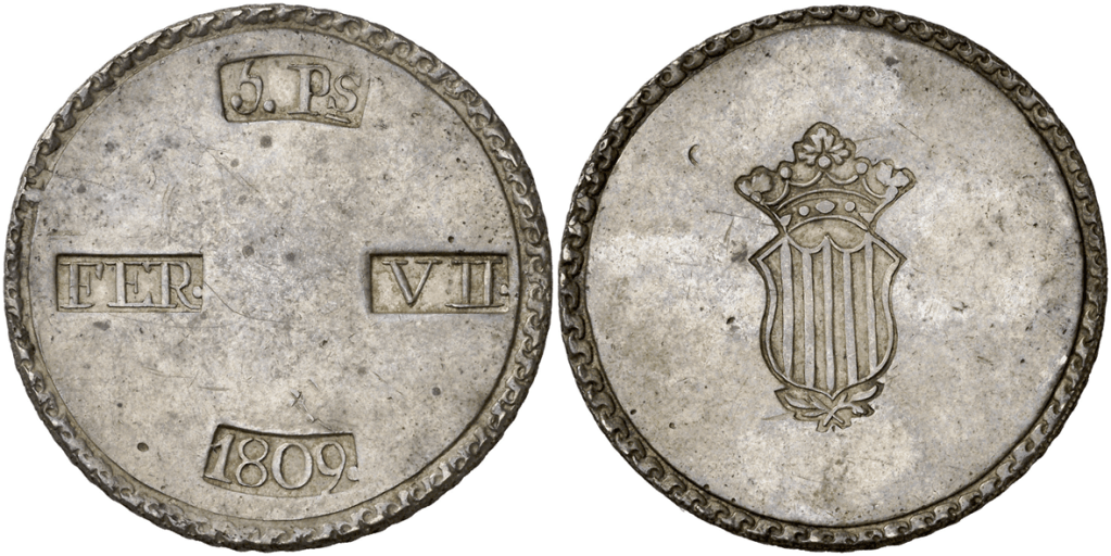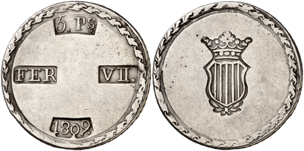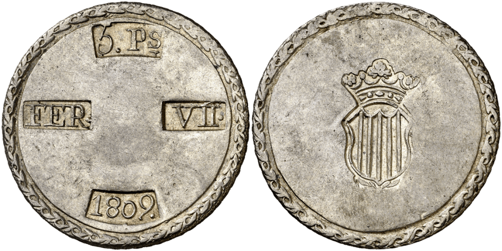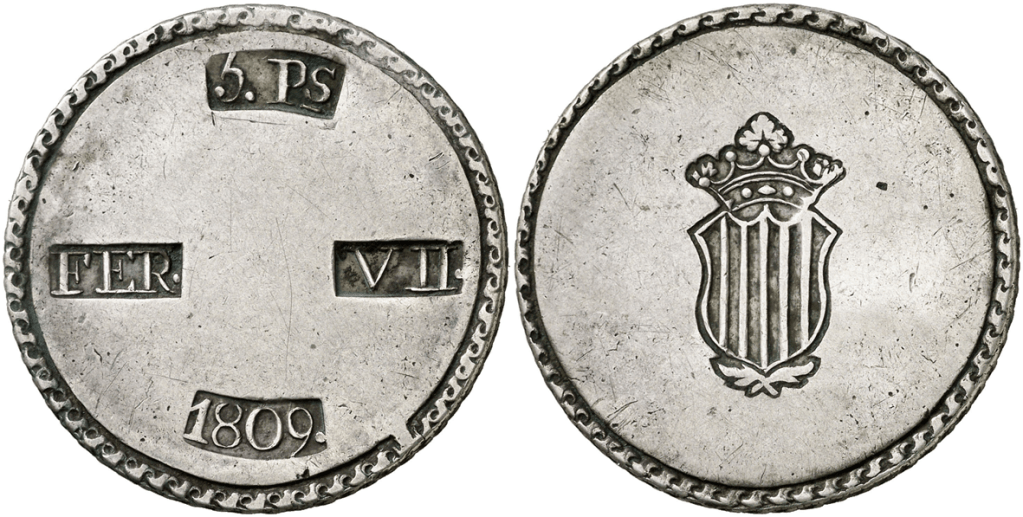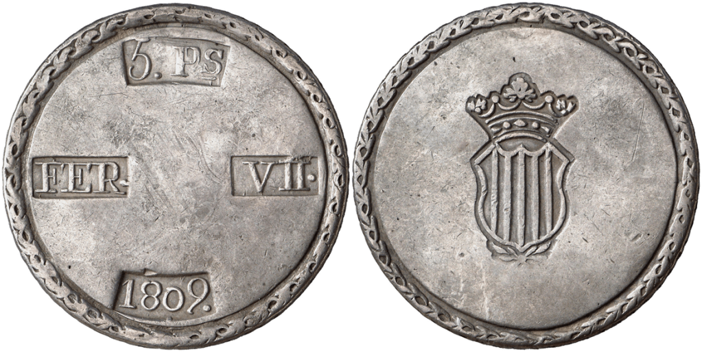 Aureo&Calico Subasta 242-1 – Lote 301. Fernando VII. 1809. Tarragona. 5 pesetas. (Cal. 653). EBC+.Aureo&Calico Subasta 367 – Lote 2496. 1809. Fernando VII. Tarragona. 5 pesetas. (AC. 1429) (Benages 1 var.1). Gráfila de ganchos. 26,64 gr. MBC+.