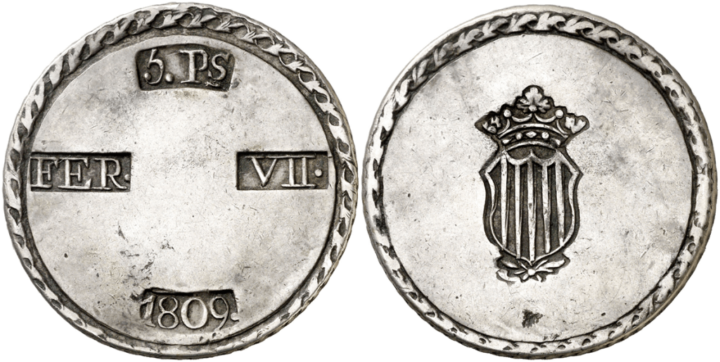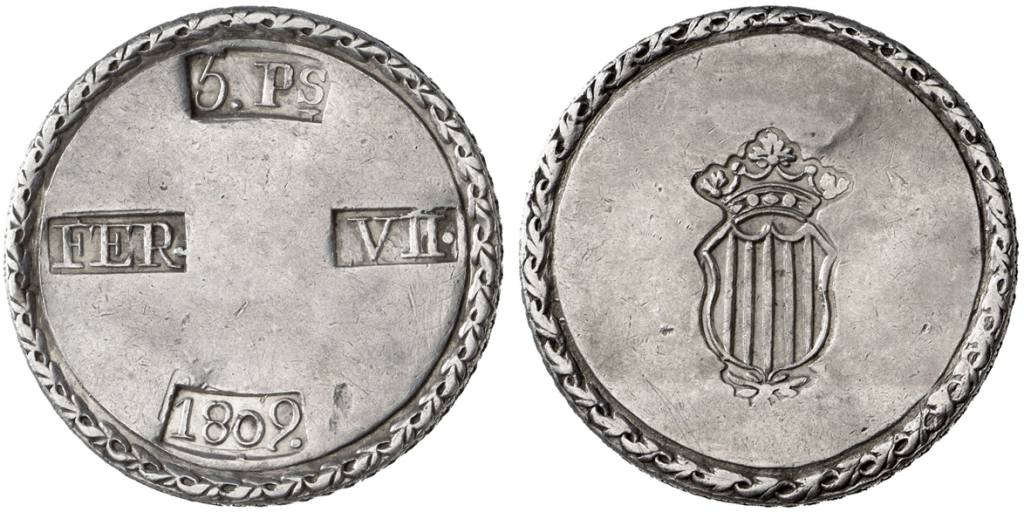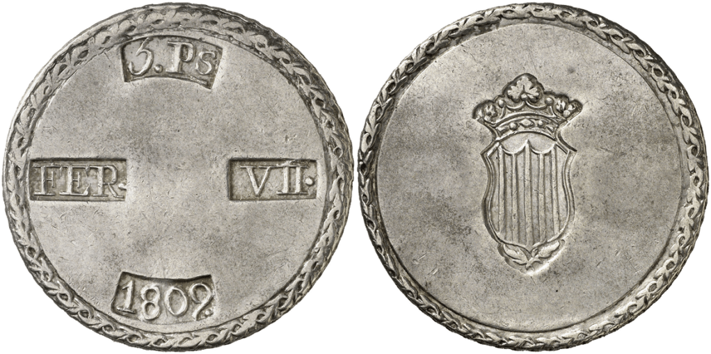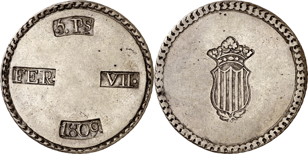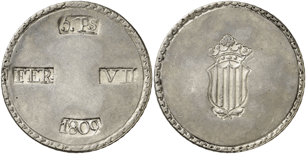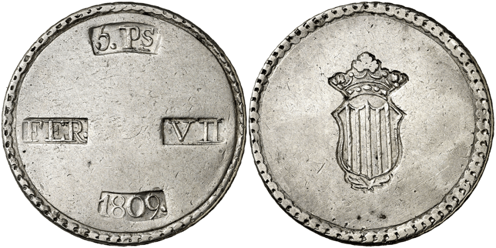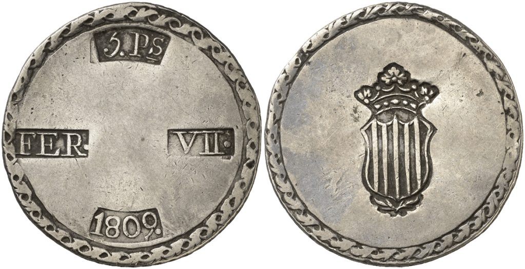 Aureo&Calico Subasta 242-1 – Lote 301. Fernando VII. 1809. Tarragona. 5 pesetas. (Cal. 653). EBC+.Aureo&Calico Subasta 367 – Lote 2496. 1809. Fernando VII. Tarragona. 5 pesetas. (AC. 1429) (Benages 1 var.1). Gráfila de ganchos. 26,64 gr. MBC+.