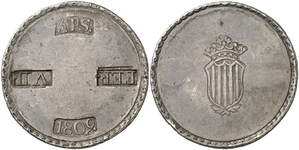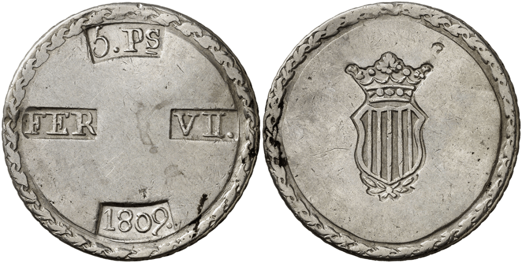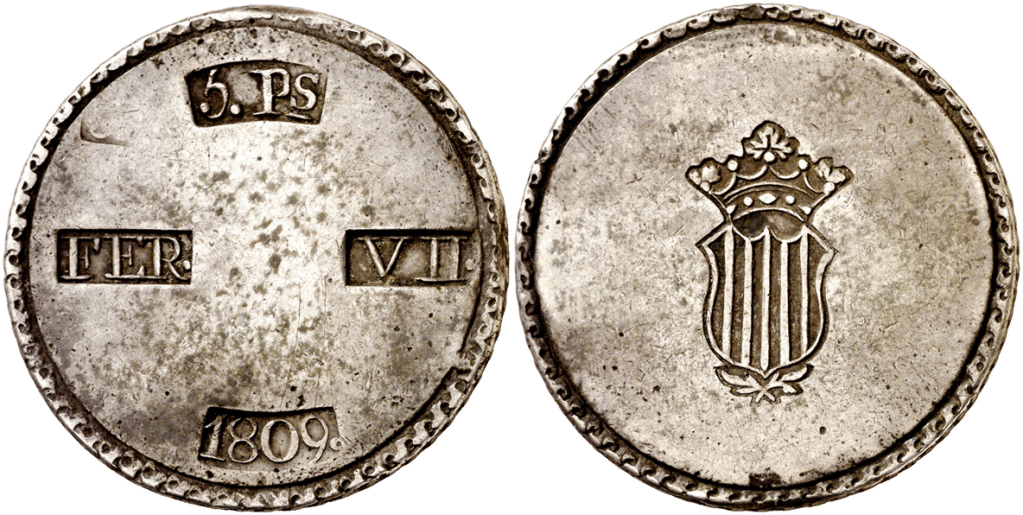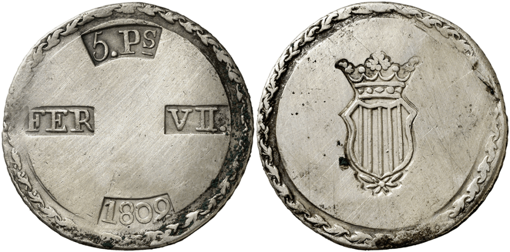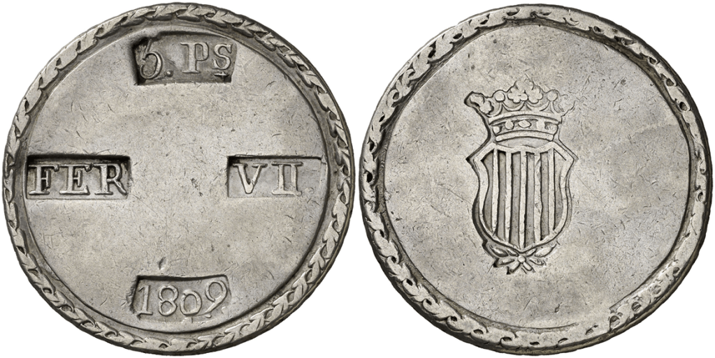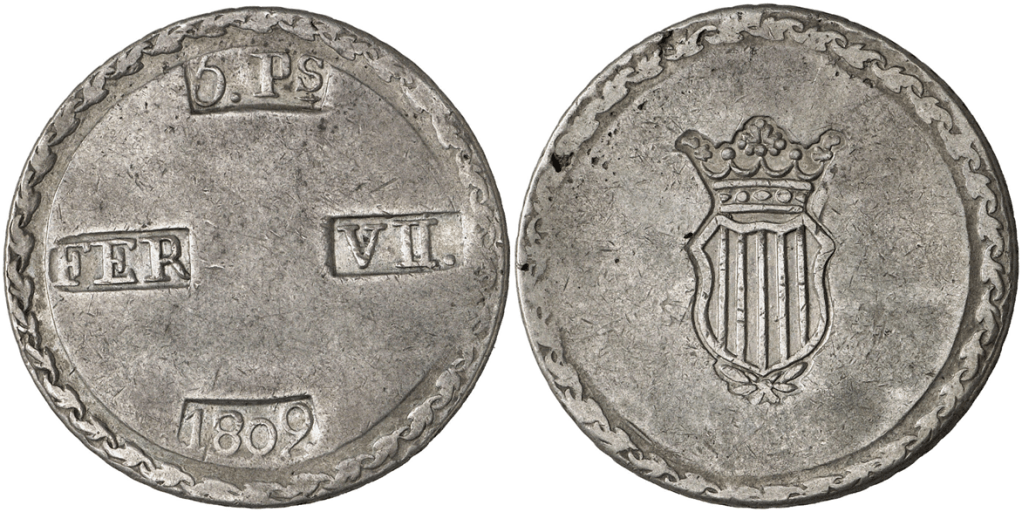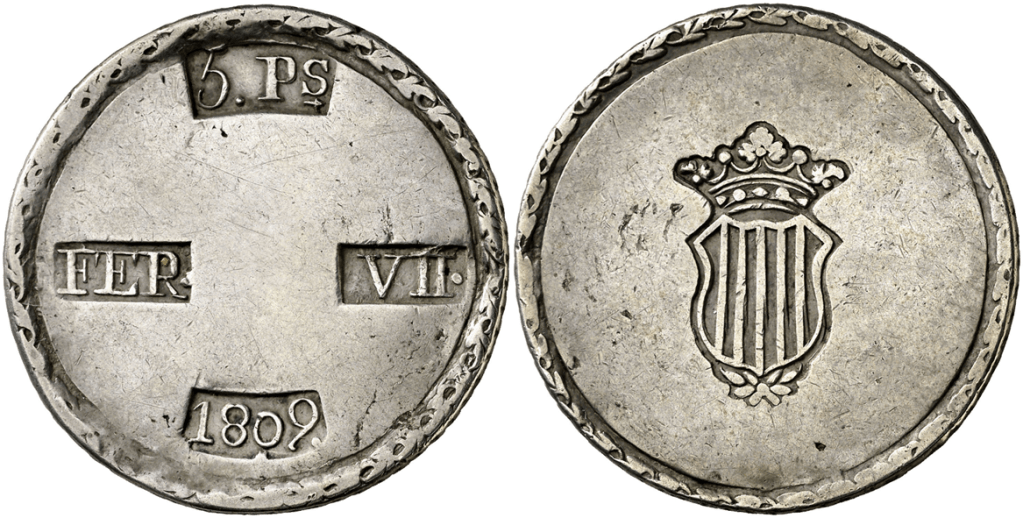 Aureo&Calico Subasta 250-2 – Lote 1571. 1809. Fernando VII. Tarragona. 5 pesetas. (Cal. 653). Escudo desplazado a la izquierda. MBC+/MBC.Aureo&Calico Subasta 209-1 – Lote 552. 1809. Tarragona. 5 pesetas. (Cal. 653). MBC.