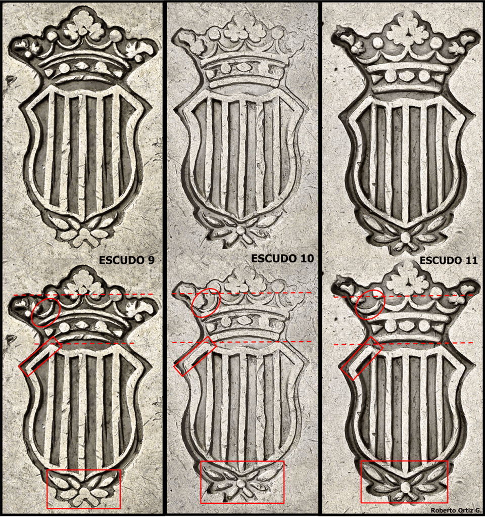 a) CORONA CON BASE LIGERAMENTE CURVA. Hojas bajo escudo con bolita central.