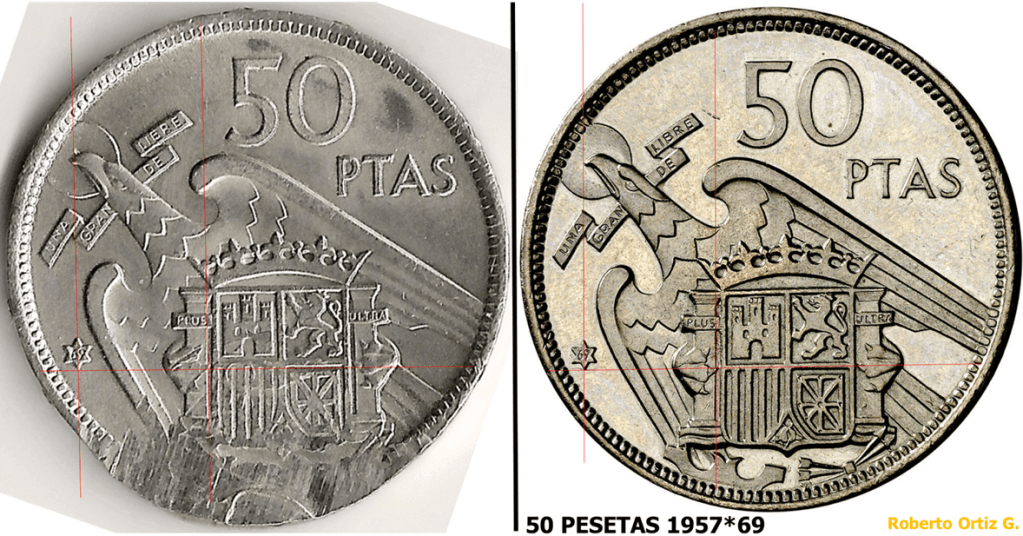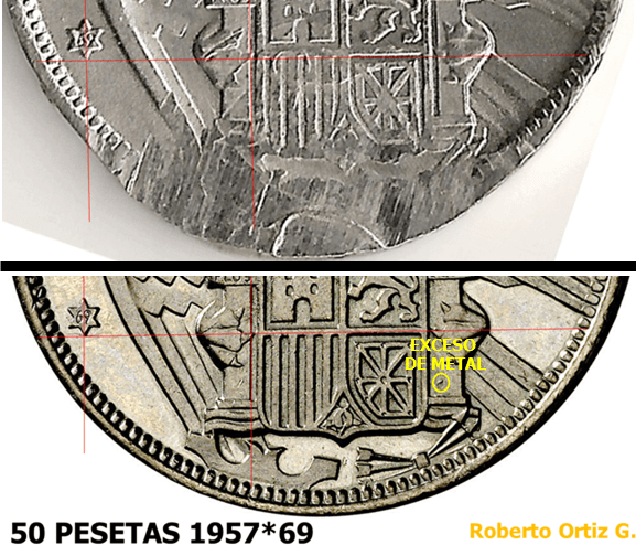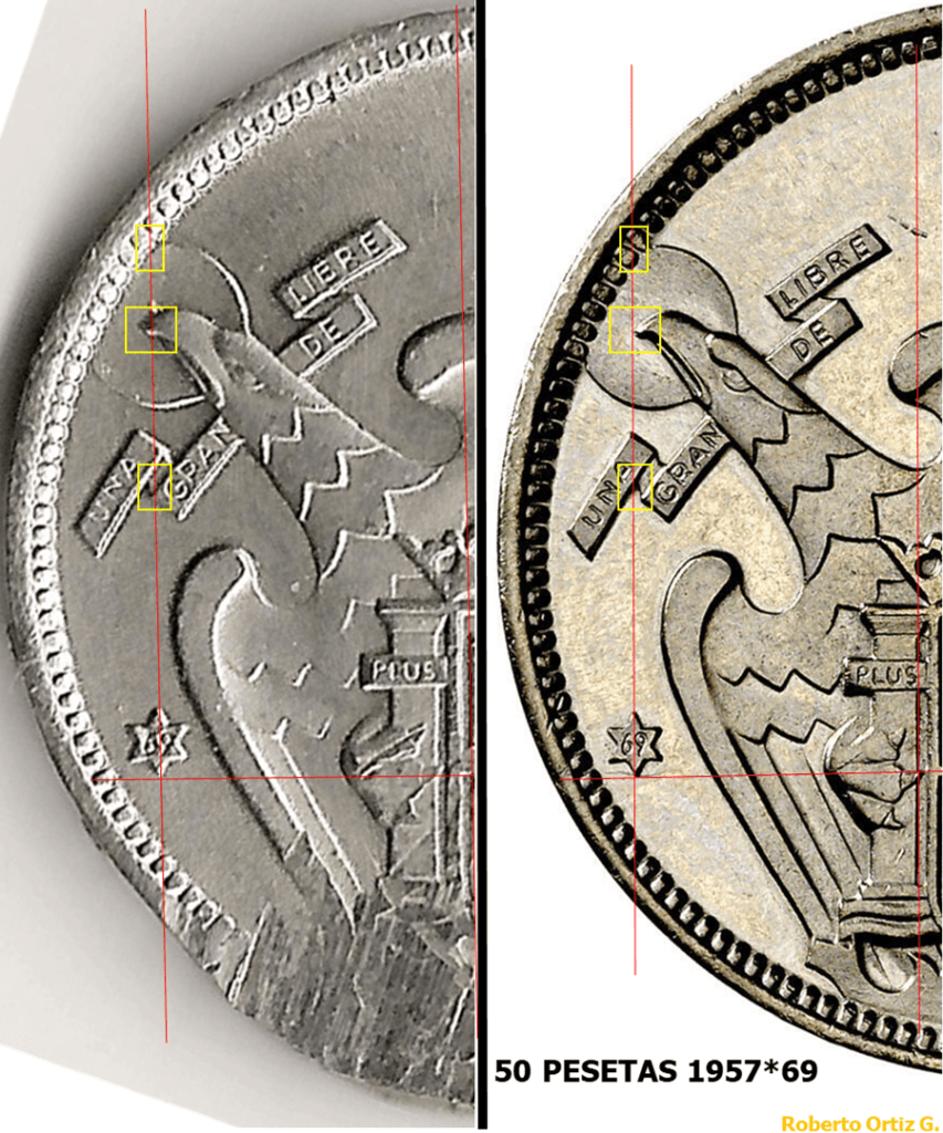 Las piezas genuinas, 50 Pesetas 1957*69, en principio, presentan, un exceso de metal en la Columna con cartela ULTRA. La pieza con certificado de autenticidad carece de dicho exceso de metal. La imagen a continuación, presenta las dos piezas anteriores.