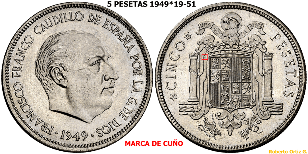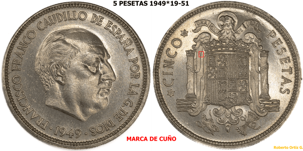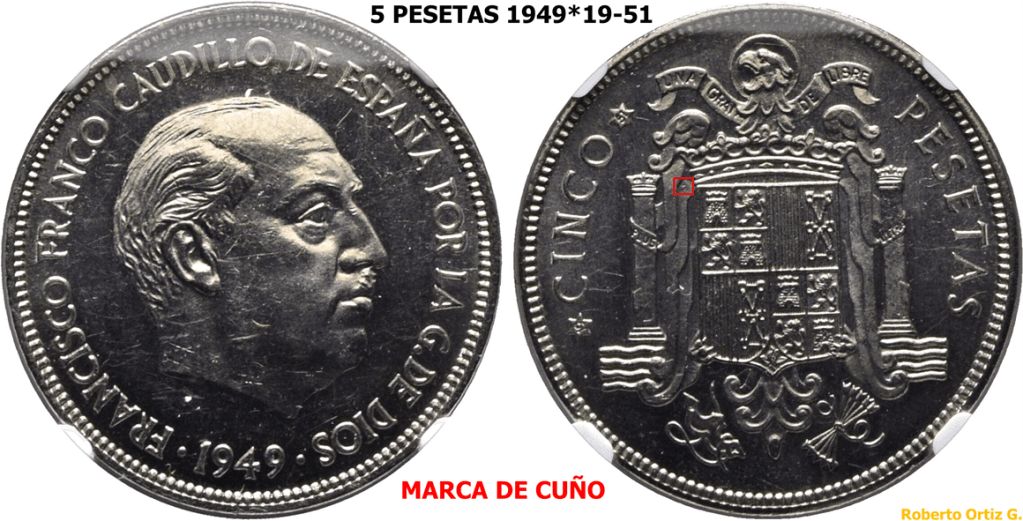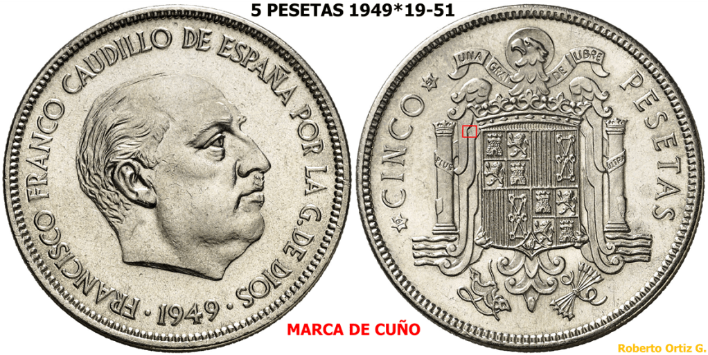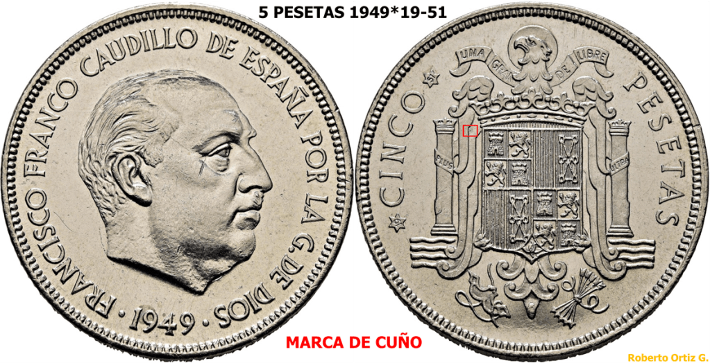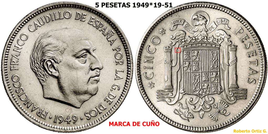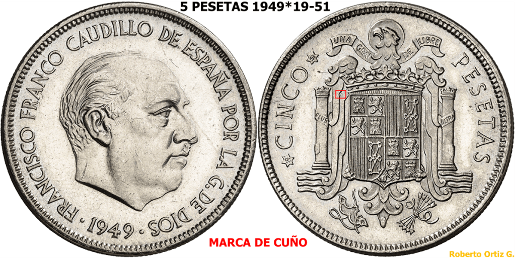 Las 5 Pesetas 1949*(19-51) es una de las piezas iconicas/emblematicas del periodo Franquista. Es una pieza que se suele manipular, troquelando/grabando algun/os digito/s en la segunda estrella. A continuación, un video de una pieza de 6 Pesetas 1949*(19-51)