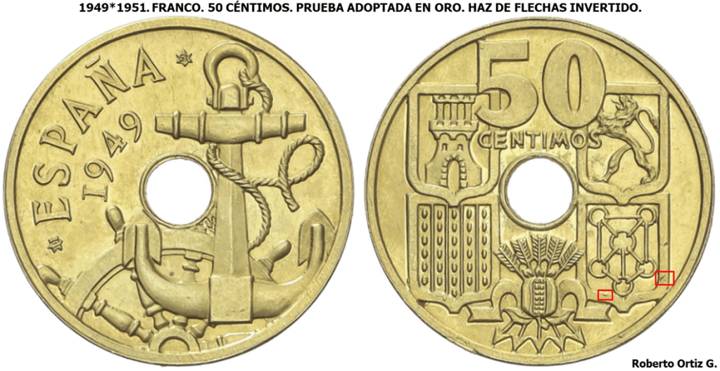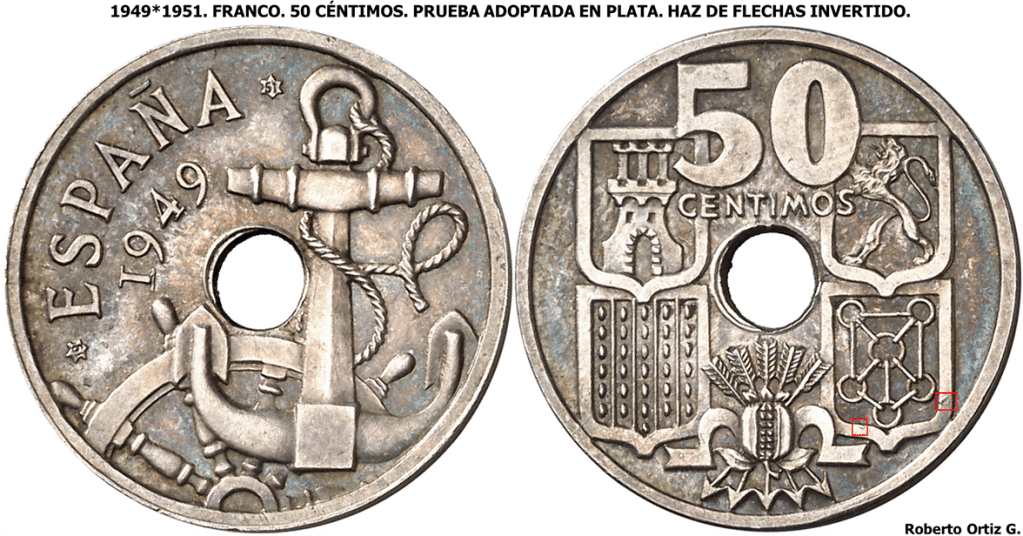 Los 50 Céntimos 1949*19-51 flechas invertidas son una de las piezas mas conocidas del periodo Franquista. El cospel presenta una aleación de cobre 750 y níquel 250 milésimas. Su diámetro es de 20 mm con un peso de 4 gramos. Fabricadas en la FMNT, con una tirada 990.000 piezas, su grabador fue Carlos Mingo.