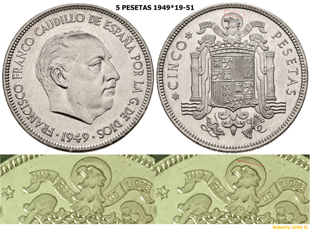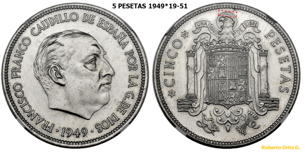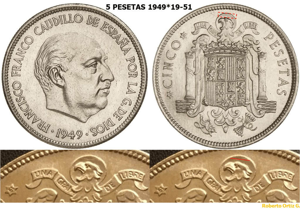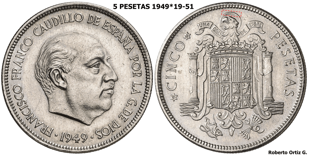 En 5 PESETAS 1949*(19-51). ESTADO ESPAÑOL. DISTINTIVO DE CUÑO. veíamos como un detalle podía ayudarnos en caso de duda. Parece ser que hay otro cuño para esta emisión. Que haya varios cuños, cuadra con la tirada dada por el director de la FMNT. Una ceca, en principio, no abre dos cuños de reverso para acuñar una docena de monedas. La tirada de las 5 Pesetas 1949 en sus diferentes años – 5 PESETAS 1949*(19-52). ESTADO ESPAÑOL. DISTINTIVO DE CUÑO.