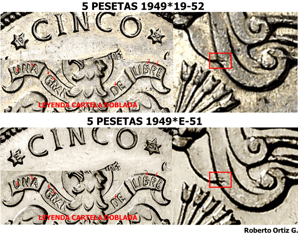 Ambas piezas tienen mismo origen, origen FMNT por supuesto, pero me refiero a una de las fases del proceso de acuñación como comento brevemente en 5 PESETAS 1949*E-51. DOS REVERSOS.