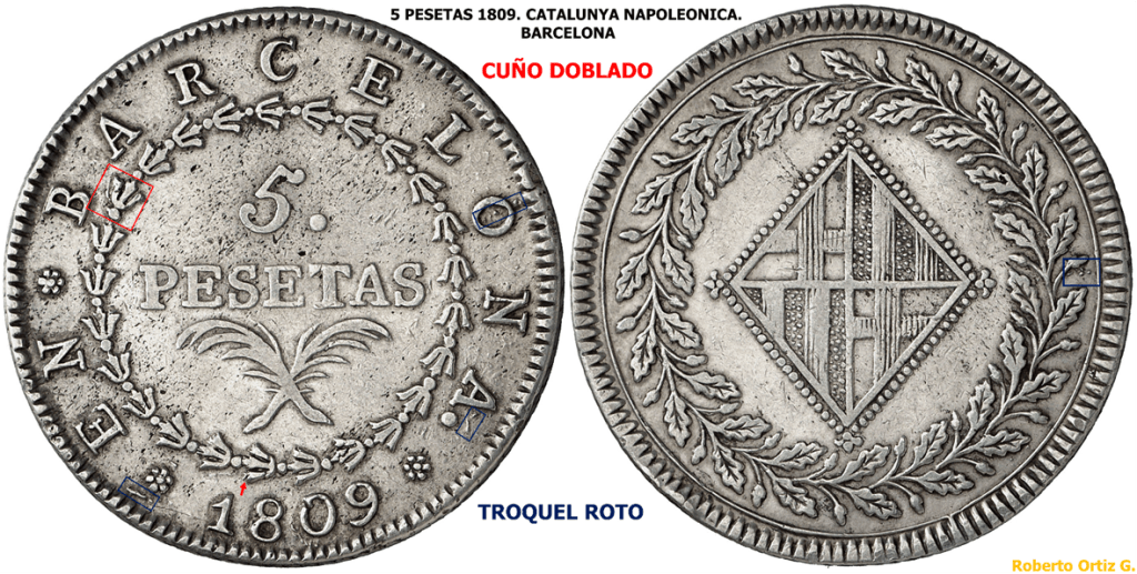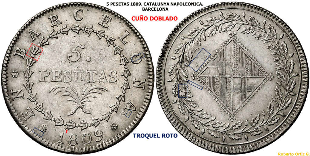 http://www.administraciondigital.es/index.php?option=com_k2&view=item&id=265:11-las-emisiones-de-jos%C3%A9-napole%C3%B3n-en-catalu%C3%B1a …en la ciudad de Barcelona que en poder de las tropas francesas desde el 12 de febrero de 1808, permaneció bajo su dominación hasta el principio de 1814. Ello posibilitó la continuidad de las emisiones de moneda en la Ceca de Barcelona desde su apertura, decretada el 21 de agosto de 1808, hasta su cierre el 30 de mayo de 1814. Las piezas de 5 Pesetas se acuñaron en todos los años de 1808 a 1814, citando el Repertorio de las Monedas Napoleonidas de Mey y Poindessault, la cifra de 1.000.146 piezas, producidas durante los 7 años. Cuatro de estos años (los de 1809 1812) no son raros,…