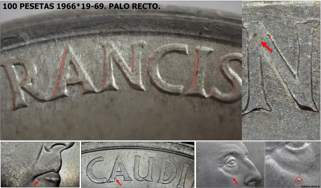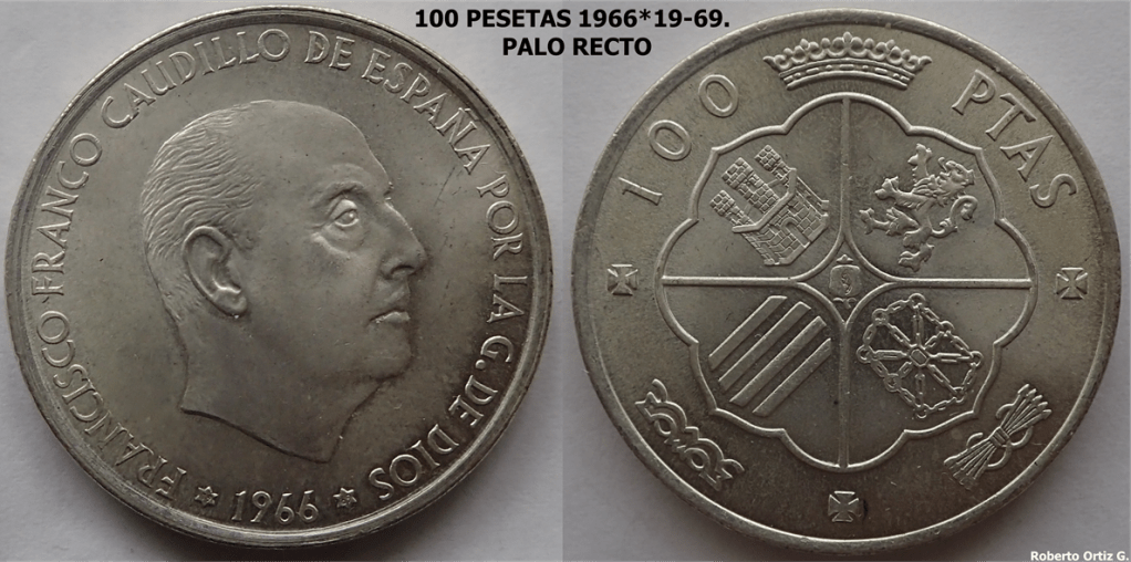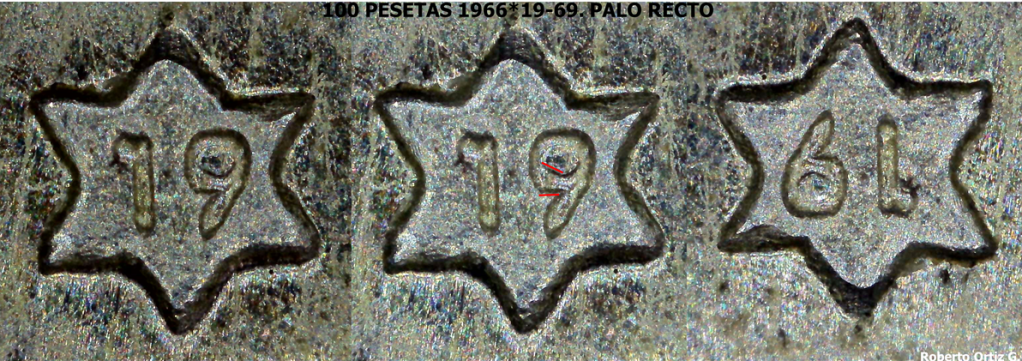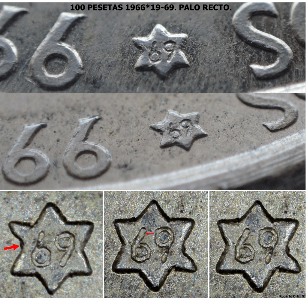 Las 100 Pesetas 1966*19-69 variante Palo Recto, es una pieza muy sencilla de reconocer. Como reconocer las 100 PESETAS 1966*(19-69). PALO RECTO. Hay muchísimas manipulaciones de la segunda estrella, principalmente con Piezas *67. Pondré fotos de una pieza genuina, y en algunas de ellas, señalare detalles nuevos de estas piezas.