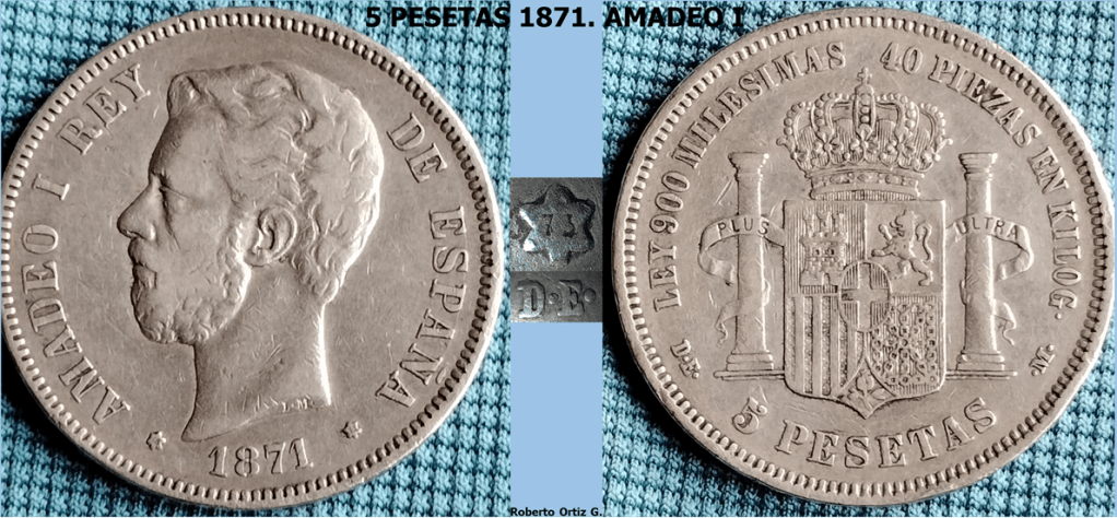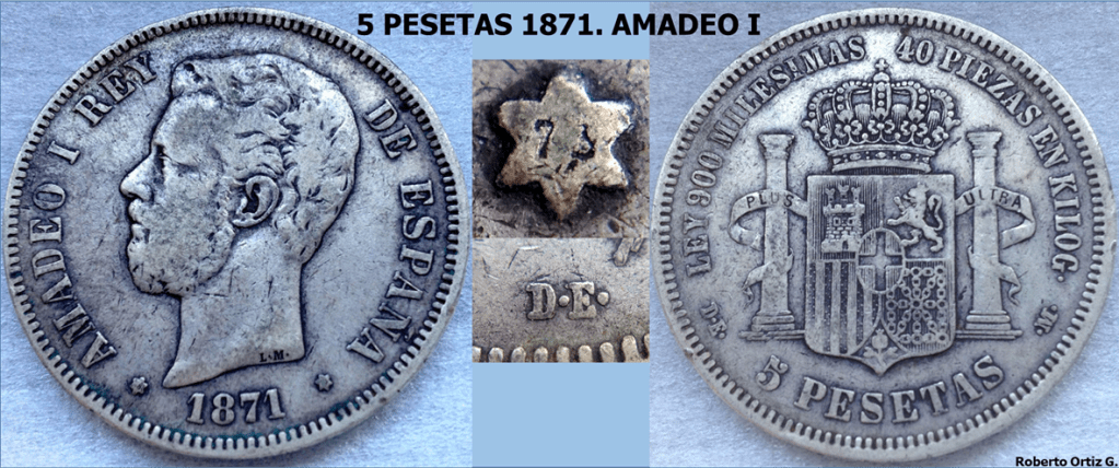 Las 5 Pesetas 1971*19-73 de Amadeo I, es una de las piezas que mas debate genera a la hora de establecer su autenticidad. Tiene una tirada escasa, J.Mª Aledon (La Peseta. Catalogo Básico), habla de fabricación de unos millares con fecha 18-73. La mayoría de sus ejemplares se encuentran circulados. Este duro presenta 138 piñones/perlas tanto en anverso como reverso.