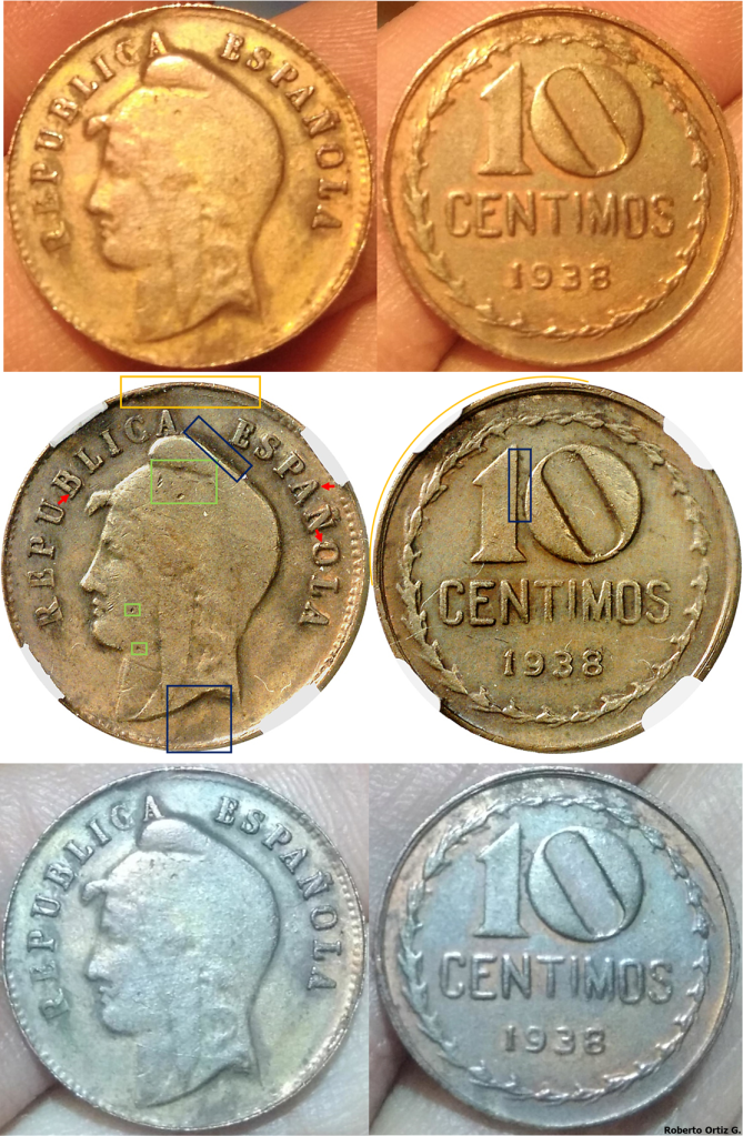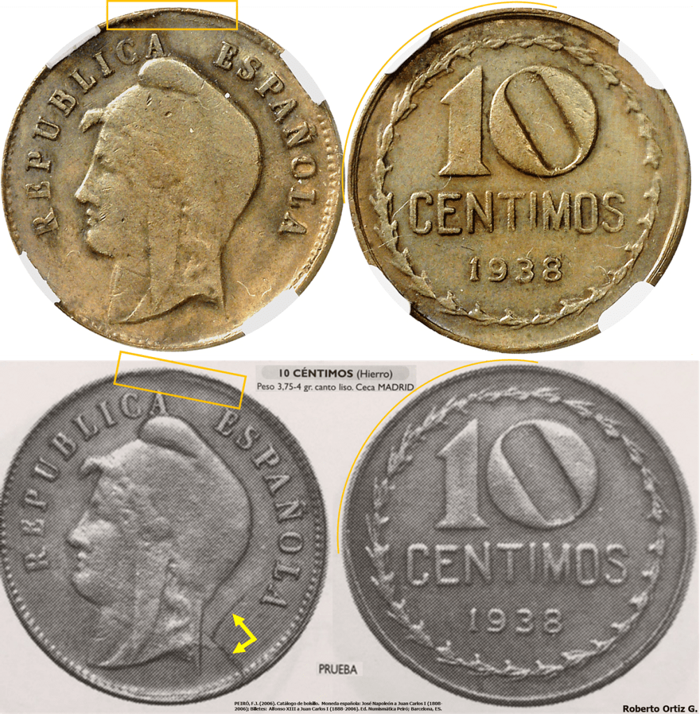 La pieza presenta el mismo diseño de reverso que – 10 CENTIMOS 1938. Segunda Republica. DISTINTIVOS DE CUÑO. Pero no presenta los perfiles doblados señalados.