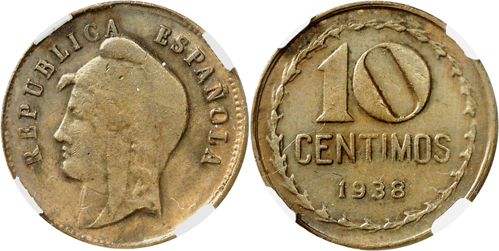 La misma pieza fue subastada en 2023, y Adolfo Ruiz Calleja, habla de ella, en una entrada de su Blog –https://blognumismatico.com/2023/03/25/10-centimos-1938-prueba-no-adoptada/