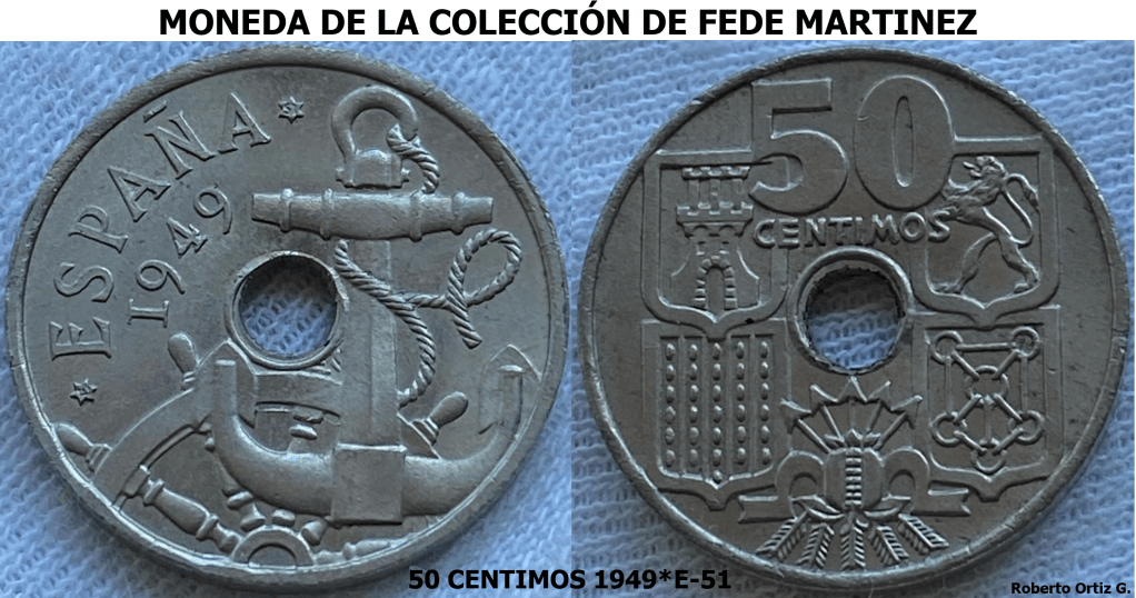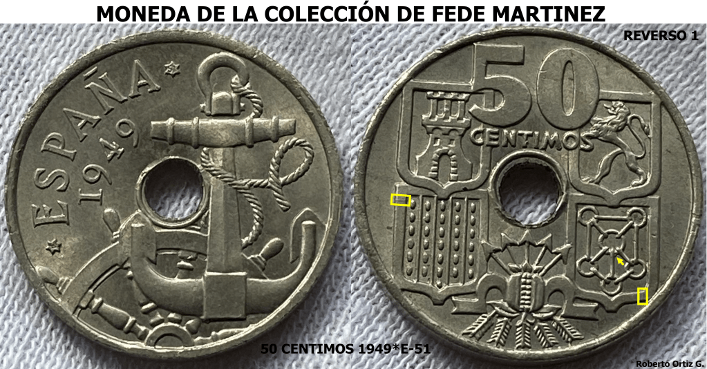 La serie E51 es muy conocida entre los coleccionistas del Periodo Franquista. 5 PESETAS 1949*E-51. DOS REVERSOS. A continuación, vamos a analizar detalles, de dos piezas de 50 Céntimos 1949*E-51.