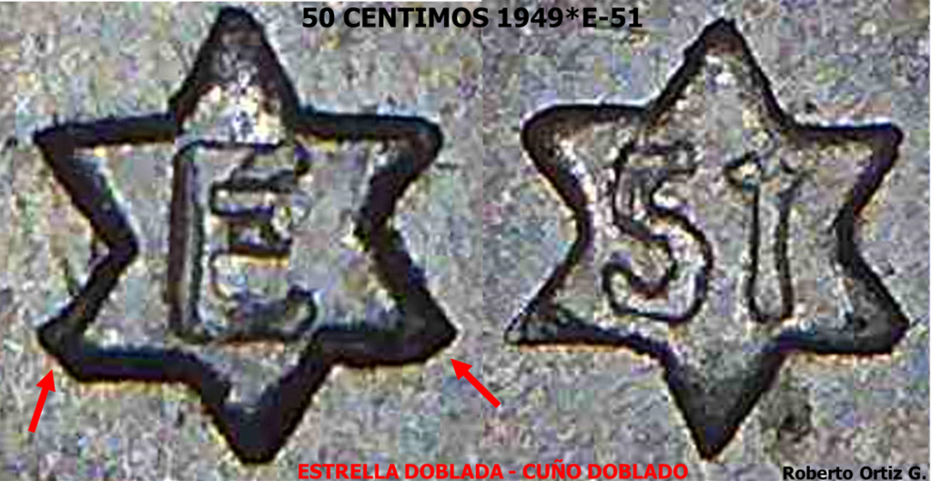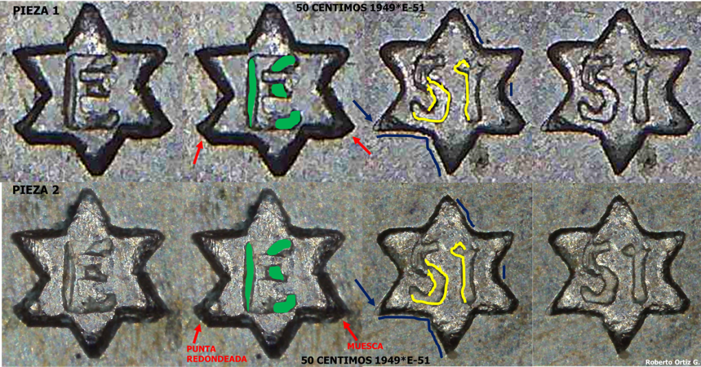 Tanto el diseño y Doblado de la estrella, como la posición, acuñación y diseño de la sigla E, son iguales en ambas piezas. Todo ello, nos lleva a pensar en un único troquel de anverso, para la acuñación de los 50 Céntimos 1949*E-51.