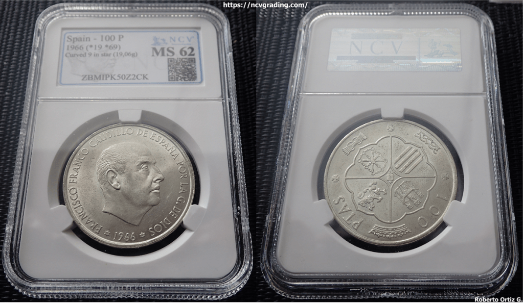 NCV GRADING es una empresa de graduación numismatica. Hace unas semanas, envie unas piezas a encapsular. Una ya la expuse – 100 Pesetas 1966*19-69. Palo Curvo. NCV GRADING. A continuación muestro otra de ellas.