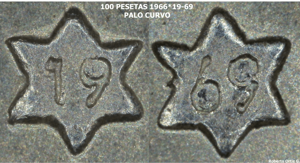 Es una pieza de 100 Pesetas 1966*19-69 – Palo Curvo. La pieza no presenta marcas incusas ni en la oreja ni en el ojo.