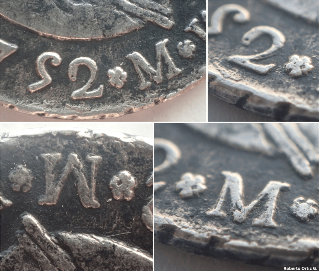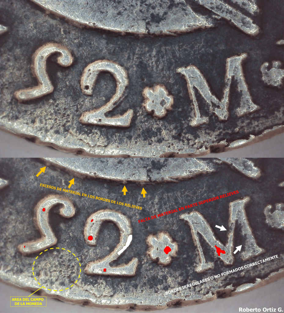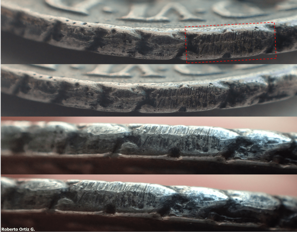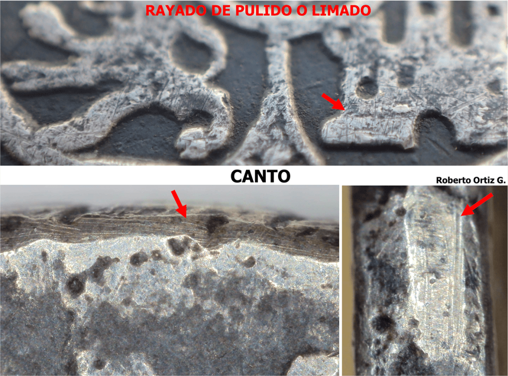 Tanto los relieves de ambas caras como el canto de la moneda, presentan un rayado, fruto de la acción de limar o pulir.
