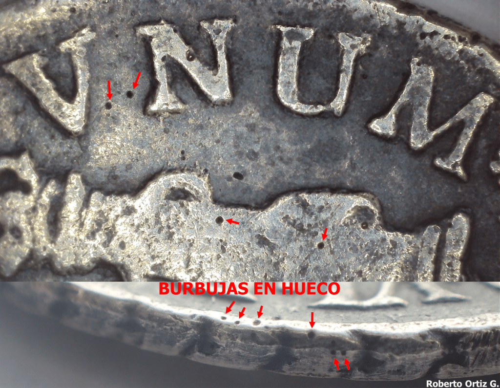 Detalle que todos conocen de las piezas fundidas. Las burbujas en hueco. https://www.tesorillo.com/fakes/14/14.htm