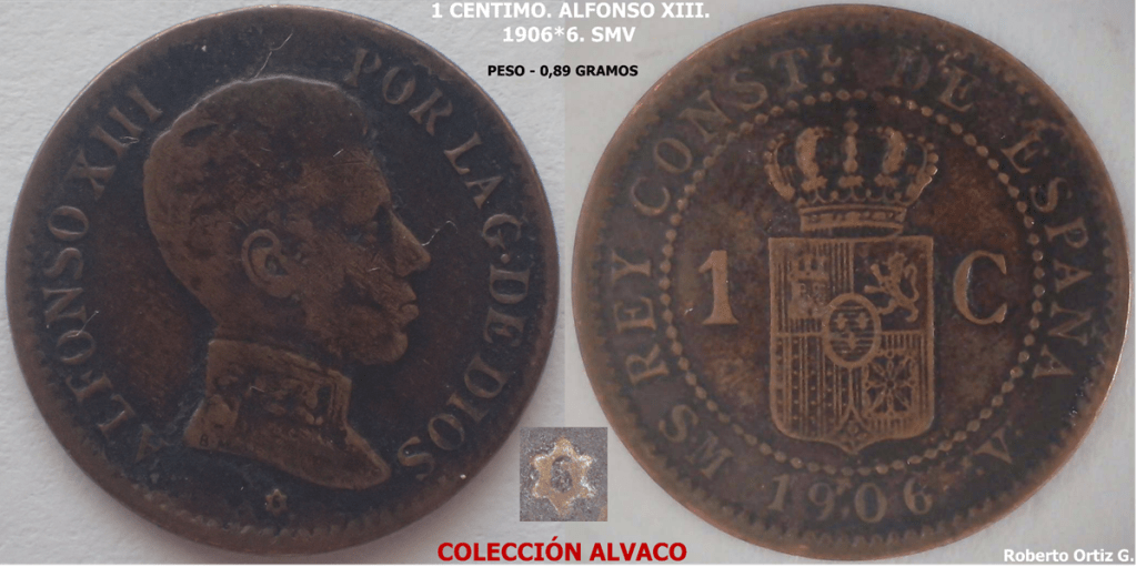 Céntimo raro. Se suele falsificar a partir del céntimo SL- V de la misma fecha. Hay que fijarse en la siglas M, su arte/diseño, tamaño y posicion. Los falsaríos recurren a veces a retirar la sigla M (ensayador), de los 2 centimos de 1904 y 1905, y emplazarla en 1 Centimo 1906*6 SLV. La siguiente pieza, ha sufrido un proceso de limpieza severo. ¿Es una pieza manipulada?.