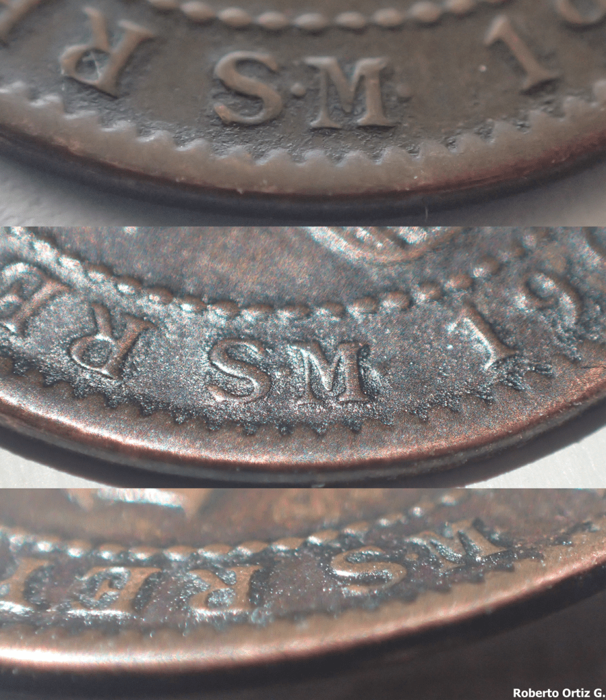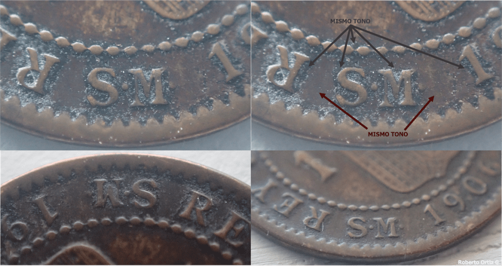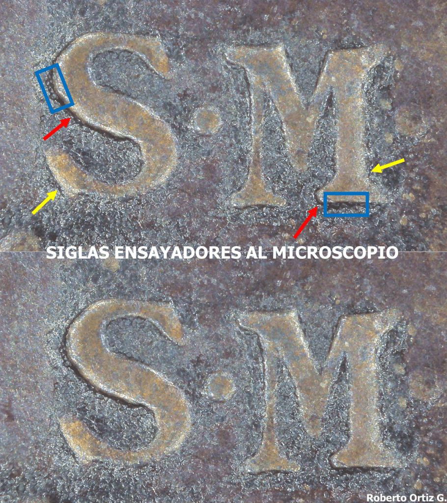 En principio, la posición y el tamaño de ambas siglas es acorde con el de las piezas genuinas. La altura de ambas siglas varía. Las flechas señalan áreas del contorno de las siglas con similar altura. El tono de ambas siglas es parecido, o al menos se puede decir que no es distinto. El campo alrededor de ambas siglas también es similar en tono y textura. El recuadro azul de la imagen anterior, muestra, misma textura en el borde de ambas siglas. Ni con la lupa, ni al microscopio, se logra apreciar signos de manipulación, como desniveles, retoques, signos de limado,… en el campo próximo al contorno de la sigla M.