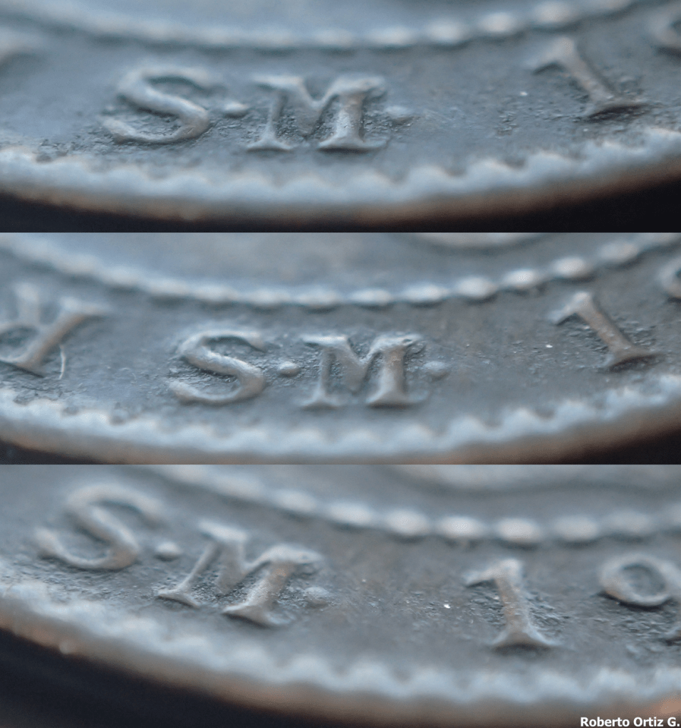 A veces se manipulan monedas, tallando sobre el campo la nueva sigla. Se retira metal del campo y/o de otra sigla, hasta conseguir el diseño del nuevo relieve. La altura del nuevo relieve, en principio, estará al nivel del campo, y habrá un desnivel en el campo, próximo al nuevo relieve, consecuencia de la manipulación. La sigla M no esta al nivel del campo en altura. Ambas siglas de ensayadores se realzan sobre el campo. Eso lleva a pensar que la sigla M no ha sido tallada sobre el campo. No se aprecian desniveles en el campo próximo al borde de la sigla M, ni restos de otra sigla, ni marcas de limado.