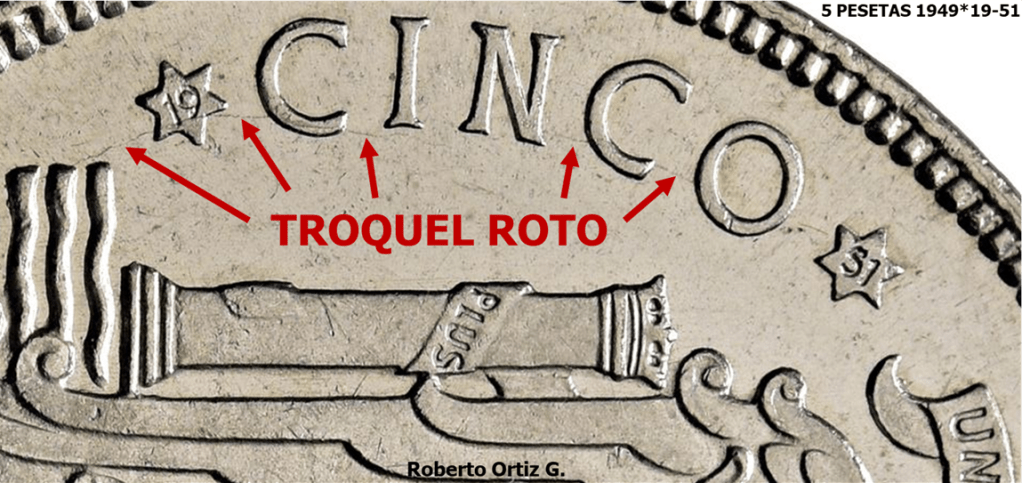 5 PESETAS 1949*19-51. CUÑO DE REVERSO 2. El pulido del troquel como distintivo de cuño.
