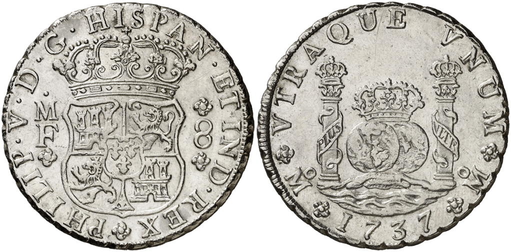 AUREO&CALICO Subasta 285-1 – Lote 1412. 1737. Felipe V. México. MF. 8 reales. (Cal. 781). 26,81 gr. Columnario. MBC.