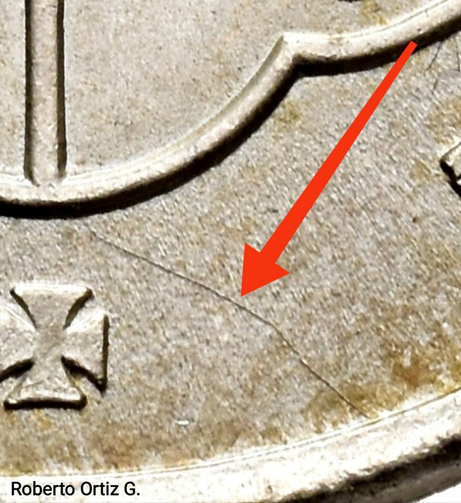 El reverso presenta otro detalle a tener en cuenta..Un troquel roto. La flecha roja señala la linea en relieve, consecuencia de la grieta del troquel de reverso.