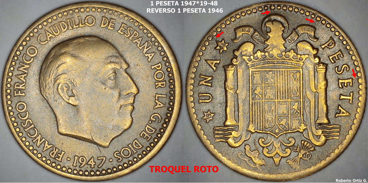 1 PESETA 1947*19-48 con REVERSO 1 PESETA 1946 ROTO.