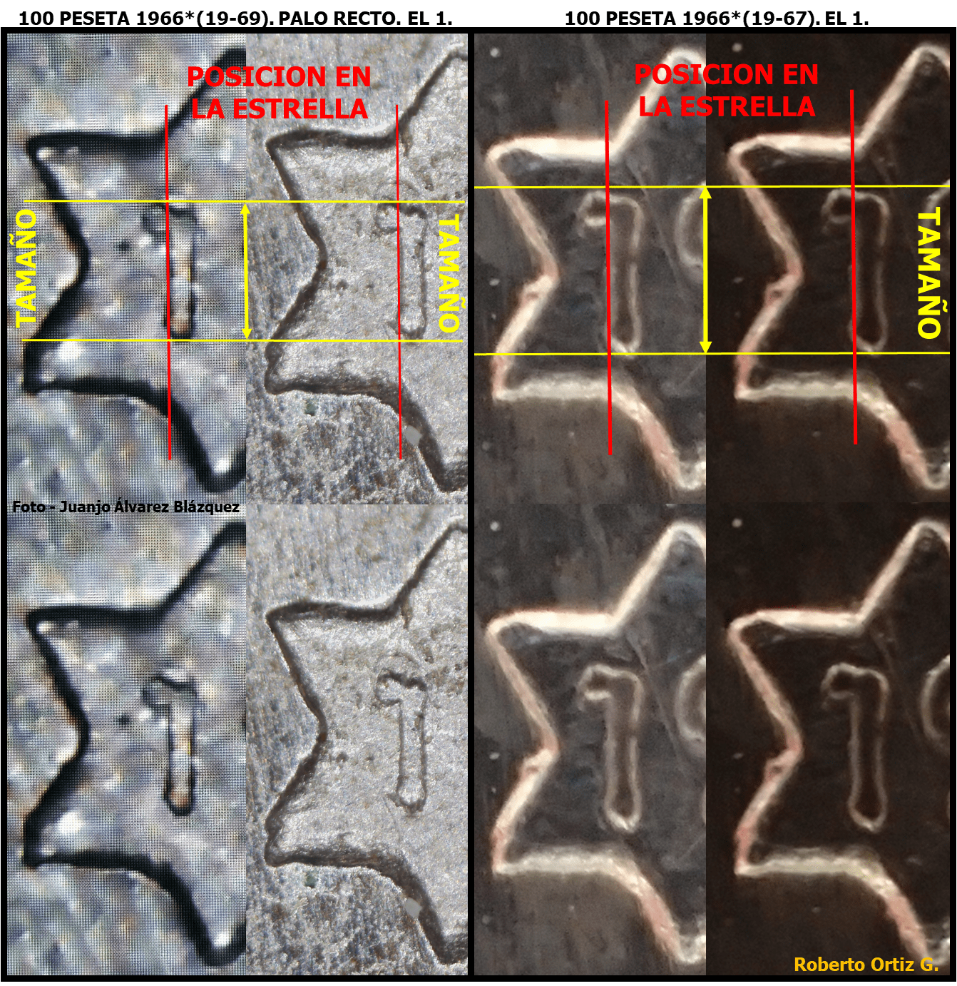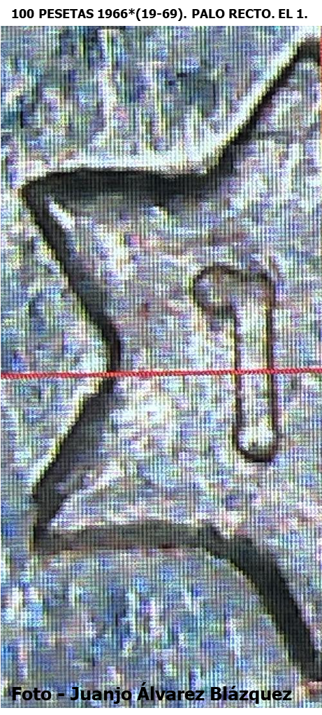 Las 100 Pesetas 1966*(19-69) Palo Recto, es una pieza muy Troquelada/manipulada, a través de piezas con distinta fecha de acuñación en las estrellas. Piezas que se manipulan, para multiplicar su valor de mercado, tratando de engañar al coleccionista. Los dígitos 1 de las 100 PESETAS 1966*19-66 y *67 (1 en Punta). Los dígitos de laSigue leyendo «EL 1 DE LAS 100 PESETAS 1966*(19-69). PALO RECTO. Comparación con *67, *68 y *70.»