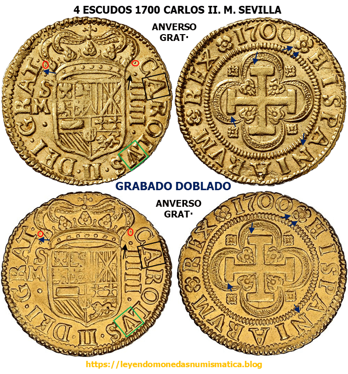 En 1699 se acuñaron en Sevilla, escudos de a 4. Voy a leer todas las piezas que conozco. 5 han aparecido en Subastas. Una hay en el Museo Arqueológico de Madrid (MAN). Tauler&Fau Subasta 4 – lote 266. Carlos II (1665-1700). 4 escudos. 1699. Sevilla. M. (Cal-117). (Tau-1385). Au. 13,46 g. Leyenda GRAT. Con escusónSigue leyendo «4 ESCUDOS 1699 CARLOS II. M. SEVILLA.»