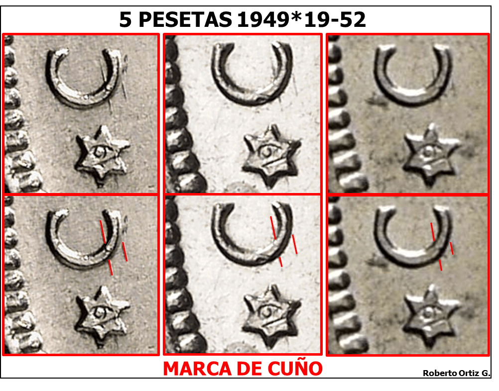 En 5 PESETAS 1949*(19-51). ESTADO ESPAÑOL. DISTINTIVO DE CUÑO. veíamos como un detalle podía ayudarnos en caso de duda. Parece ser que hay otro cuño para esta emisión. Que haya varios cuños, cuadra con la tirada dada por el director de la FMNT. Una ceca, en principio, no abre dos cuños de reverso para acuñar unaSigue leyendo «5 PESETAS 1949*19-51. Cuño de Reverso 2.»