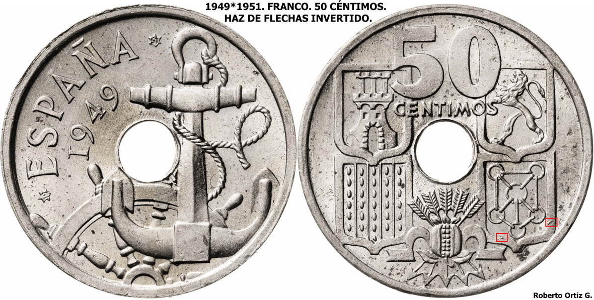 50 Céntimos 1949*(19-51). Flechas invertidas, prueba adoptada en oro y prueba adoptada en plata. Mismo origen del Troquel de Reverso.