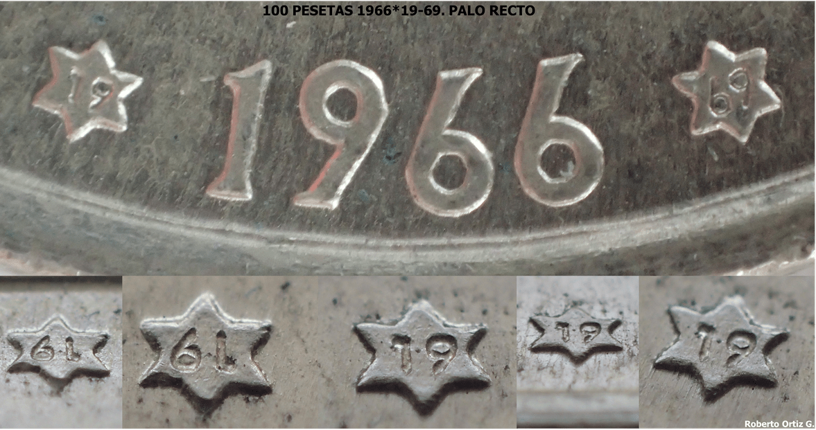 Las 100 Pesetas 1966*19-69 variante Palo Recto, es una pieza muy sencilla de reconocer. Como reconocer las 100 PESETAS 1966*(19-69). PALO RECTO. Hay muchísimas manipulaciones de la segunda estrella, principalmente con Piezas *67. Pondré fotos de una pieza genuina, y en algunas de ellas, señalare detalles nuevos de estas piezas.