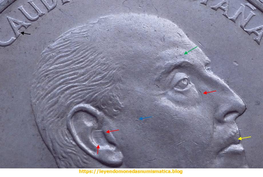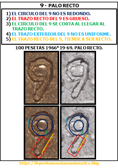 No siempre se aprecian los excesos de metal en el labio. Hay palos rectos genuinos sin dichos excesos en el labio. Pero tanto con exceso de metal, como sin el en el labio, el 9 es el mismo. Es decir, el digito 9 de la *69, tiene un único diseño. Es el 9 variante Palo recto.Sigue leyendo «100 Pesetas 1966*19-69. PALO RECTO. Estado Español. ¿UN UNICO CUÑO (DE ANVERSO)?.»