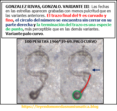 Un estudio de las estrellas 19 y 69, fue realizado por González Rivas – TRUCAJES Y FALSIFICACIONES DE LA MONEDA DE 100 PTS. DE PLATA, ESTRELLA 69. GONZALEZ RIVAS, GONZALO. Rivas habla de tres variantes para las estrellas 69: VARIANTE I: La línea circular del nueve queda cortada y escondida por el trazo recto. Esta acuñaciónSigue leyendo «100 Pesetas 1966*19-69. PALO RECTO. Estado Español. EL NUEVE.»