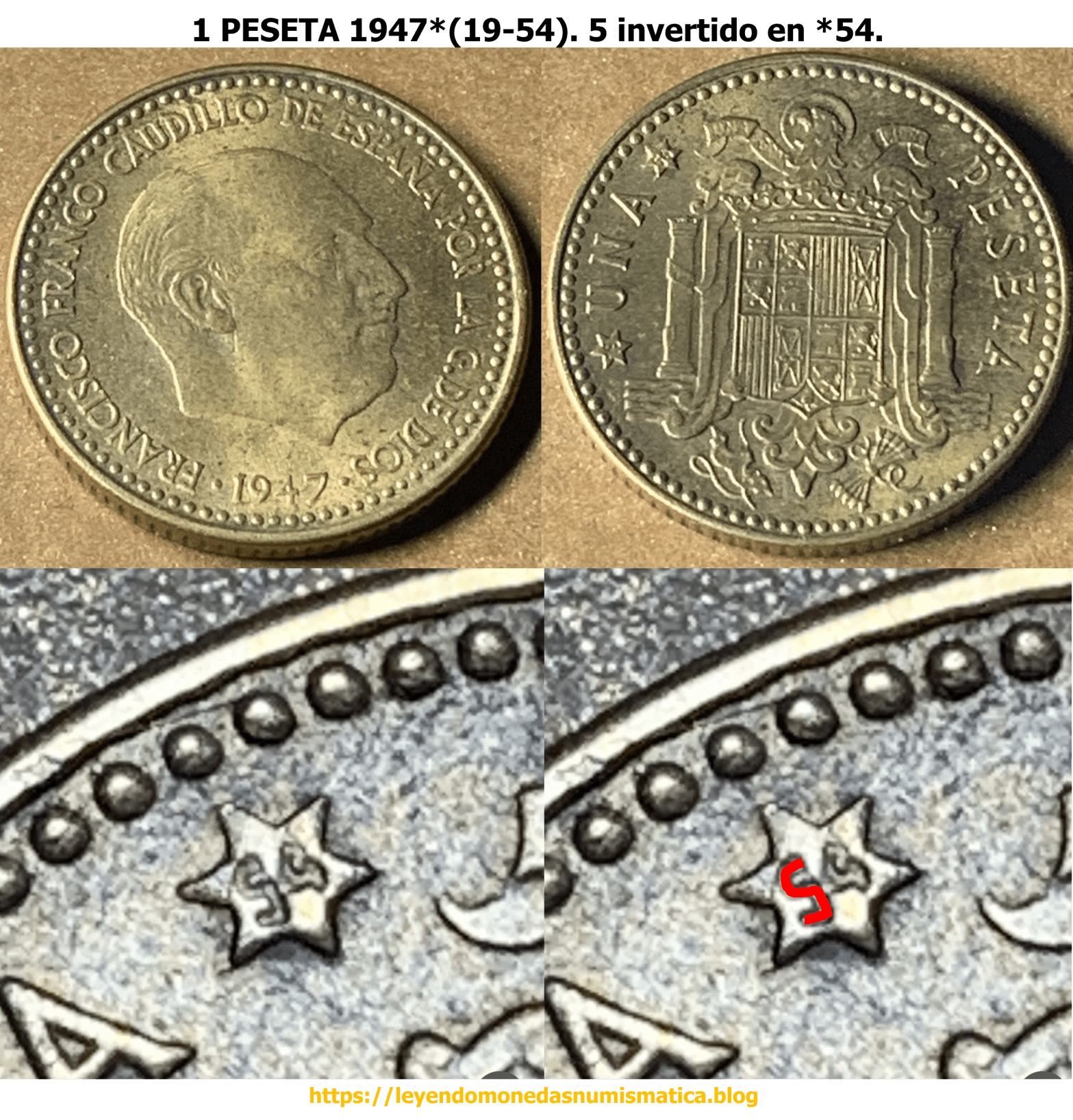 1 PESETA 1947*(19-54). Estado Español. 5 invertido en *54.