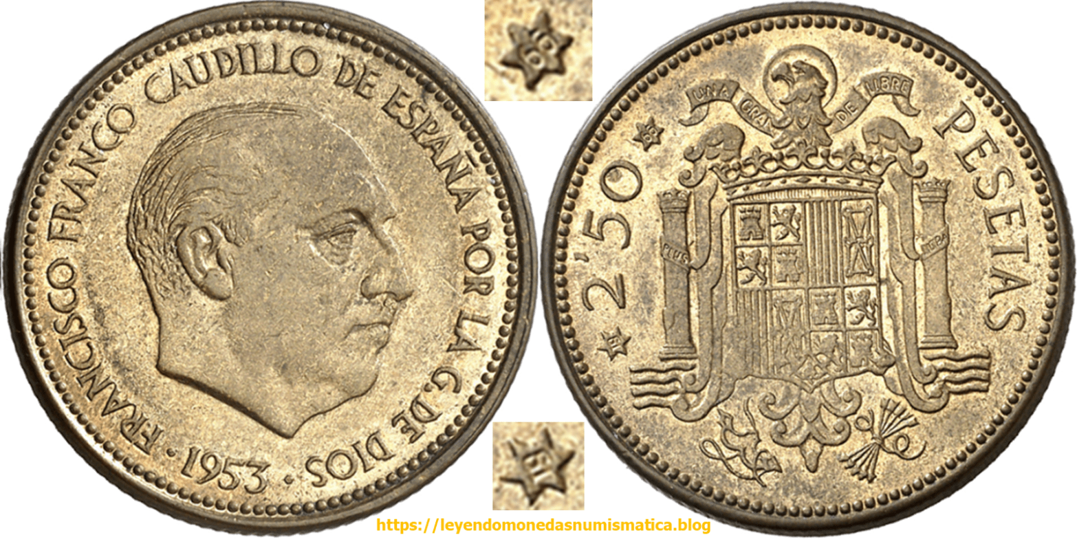 En diciembre de 2012, en la Casa de Subastas Cayón, apareció en uno de sus lotes, una pieza de 2´50 Pesetas 1953. El lote sorprendía, por la fecha (año) de acuñación de su estrella, con las decenas y unidades. 66 eran los dígitos, que aparecían en dicha estrella. La Casa de Subastas hablaba de unSigue leyendo «2´50 Pesetas 1953*(19-66). Estado Español. EL CUÑO DE ANVERSO.»
