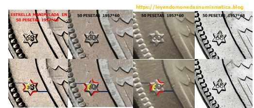 50 Pesetas 1957*60 La siguiente pieza presenta un error, que nos ofrece una pista acerca del proceso de acuñación. La posición de la estrella coincide con las piezas anteriores. El cuño Doblado delata que la estrella pertenece al diseño del Punzón de Trabajo. ¿Porque se puede afirmar esto?. Porque hay mas elementos del diseño doblados,Sigue leyendo «50 Pesetas 1957*68. Ejemplo de manipulación.»