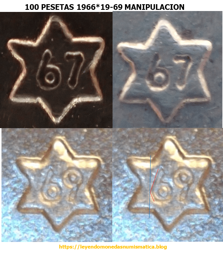Las 100 pesetas de 1966*19-69 es una pieza muy falsificada. Se recurre a otras piezas de 100 Pesetas donde se suele manipular la segunda estrella. Una de las manipulaciones, que encontramos con frecuencia, es a partir de las 100 pesetas 1966*19-67 (1 recto/7, Anverso 2 – 100 Pesetas 1966. Estado Español. DOS ANVERSOS.). Se troquela unSigue leyendo «100 Pesetas 1966*19-67. MANIPULACION PALO RECTO (*69).»
