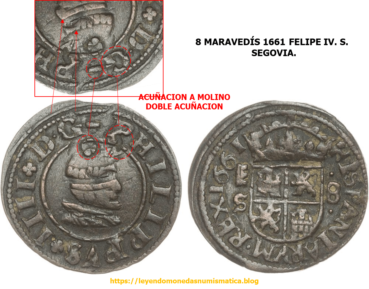 Los siguientes 16 Maravedís acuñados a molino, en la Ceca de Madrid de la puerta de Alcalá (16 Maravedíes. 1661. Y. MD. Madrid. ACUÑACION A MOLINO.), en 1663, durante el reinado de Felipe IV, presentan en su reverso una mala acuñación en una zona/área. La corona y parte de la grafila encima de la corona, presentanSigue leyendo «CUÑO RODILLO EMPASTADO. ACUÑACION A MOLINO.»