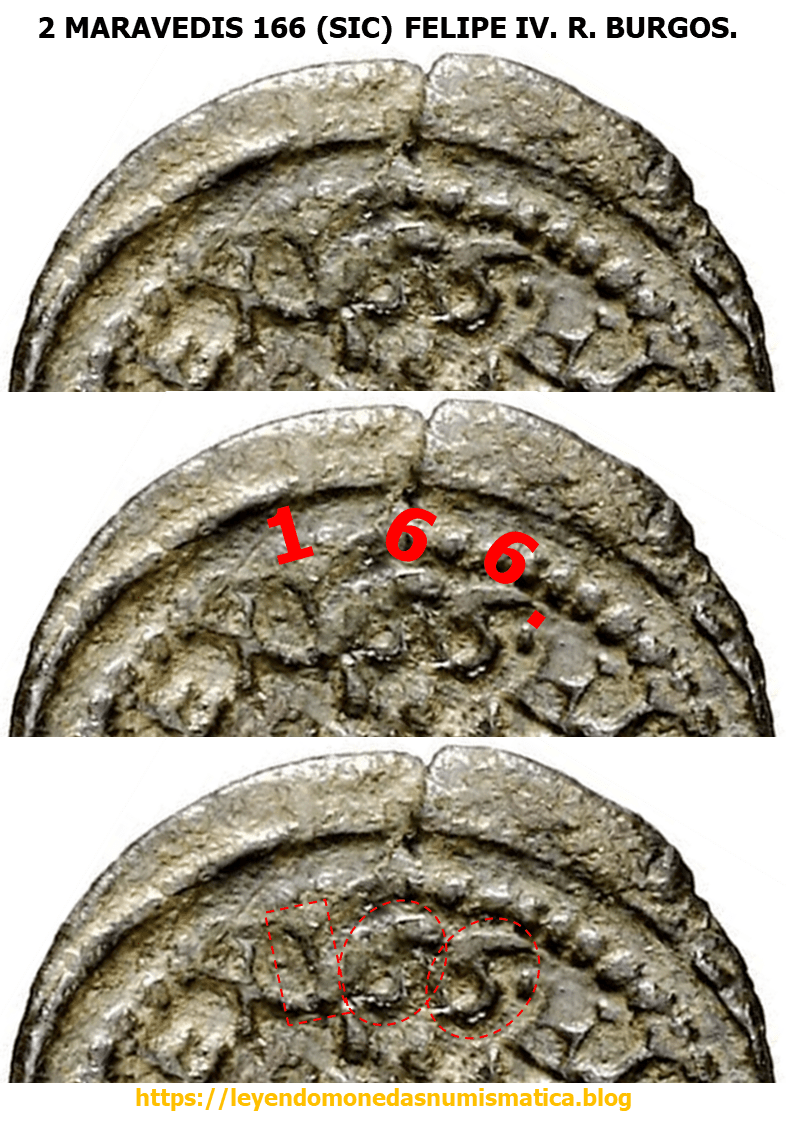 En mayo de 2017, la casa de Subastas Aureo&Calico, tenia entre sus lotes, la siguiente pieza. La pieza alcanzó los 270 euros. Acuñada a Molino durante el Reinado de Felipe IV, en la ceca de Burgos. La pieza presenta un error en la fecha. La fecha no esta completa. El ultimo dígito de la fechaSigue leyendo «2 Maravedís Felipe IV. R. Burgos. 166(sic)»