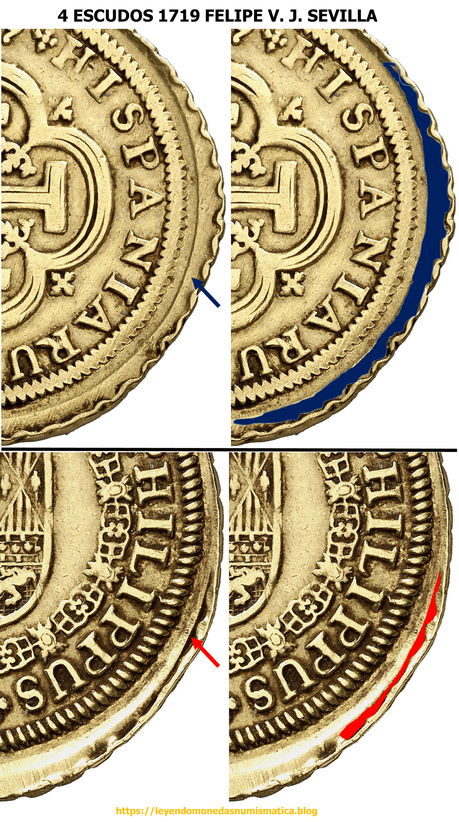 4 ESCUDOS 1719 FELIPE V. SEVILLA. ¿ACUÑACIÓN A VOLANTE O A MOLINO?