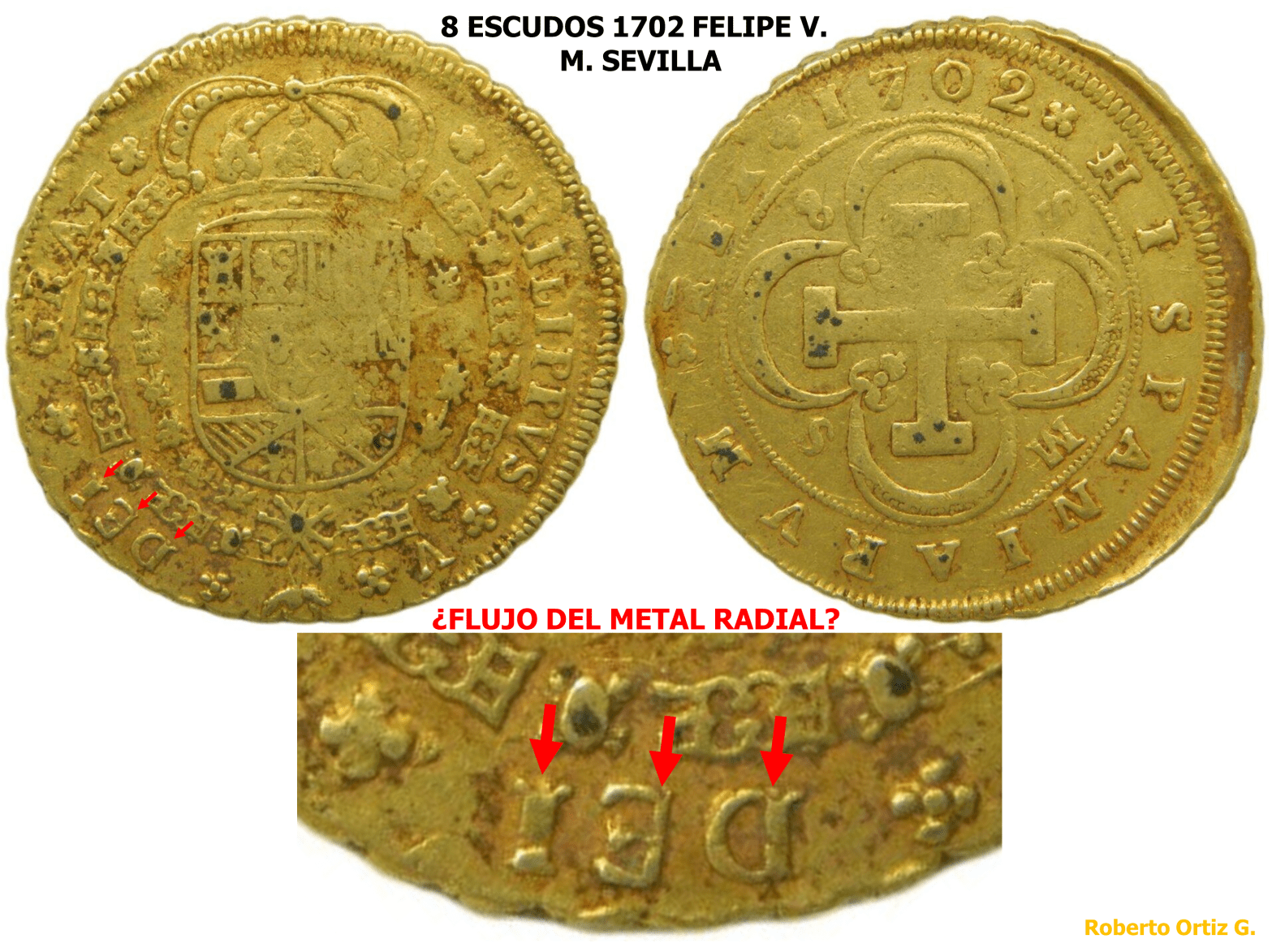 8 ESCUDOS 1702 FELIPE V. SEVILLA.¿ACUÑACION A VOLANTE?