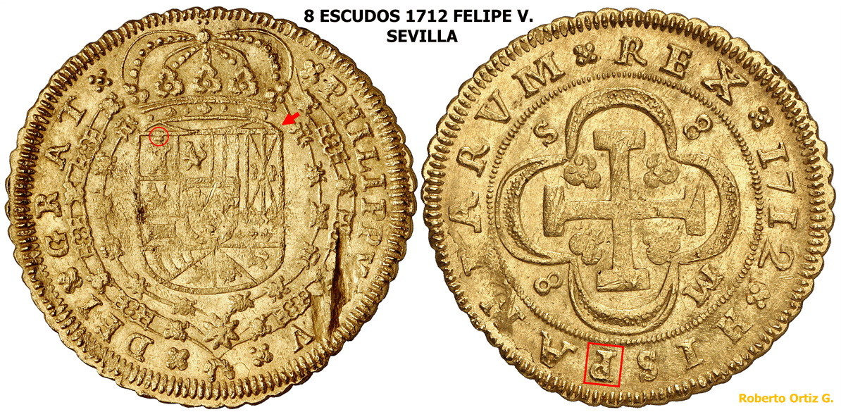 8 ESCUDOS 1712 FELIPE V. SEVILLA. REVERSO A 90º Y 180º.