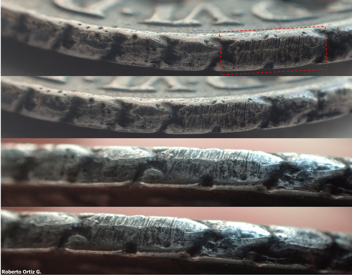 La siguiente pieza es una pieza falsa, realizada por fundición. CONTORNO DE LOS RELIEVES Unas fotos de un área del reverso. Los mismos relieves al microscopio. Los trazos blancos, señalan algunas áreas de los relieves mal formados, y con un contorno irregular. Los trazos rojos, señalan áreas superiores de los relieves con faltas de material.Sigue leyendo «2 REALES 1752 FELIPE V. MEXICO. Falsificación.»