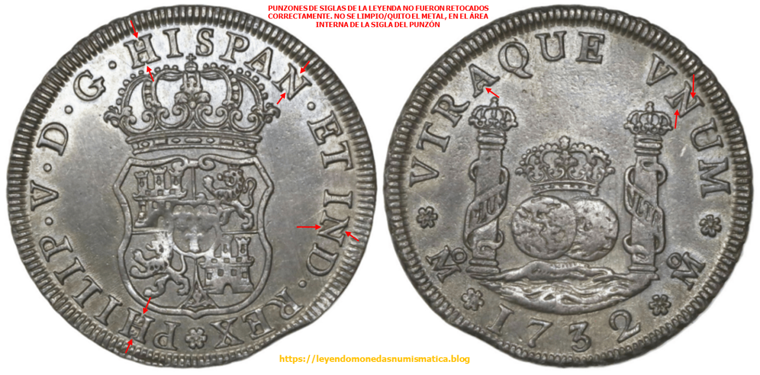 8 Reales 1732. Felipe V. México. Columnario. LAS SIGLAS EN EL CUÑO DE REVERSO (Foto Troquel).