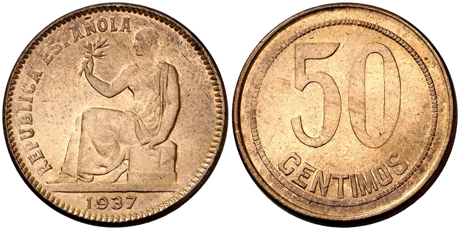 50 céntimos 1937. II Republica. ORLA MIXTA. Orla de puntos cuadrados con puntos redondos.