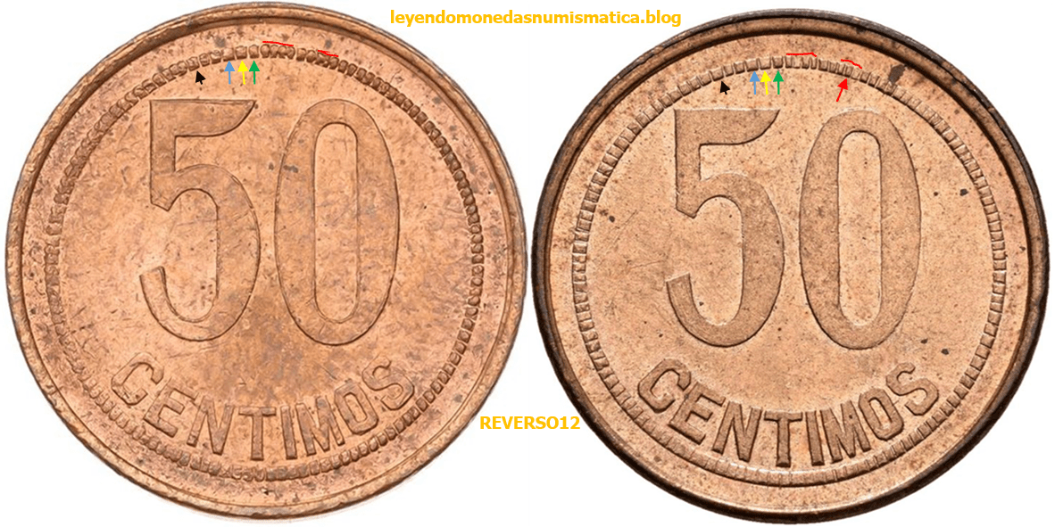 1) Orla Mixta. La Orla cuadrada tiene puntitos redondos. 2) Orla Cuadrada. Toda la orla del reverso es de cuadraditos. https://wordpress.com/post/leyendomonedasnumismatica.blog/1516 3) Comparación de los reversos de las dos piezas anteriores. a) Las flechas de colores señalan los mismos puntos cuadrados, en posición, tamaño y diseño. b) Los puntos redondos están sobre los puntos cuadradosSigue leyendo «50 céntimos 1937. II Republica. ORLA MIXTA. Orla de puntos cuadrados con puntos redondos.»